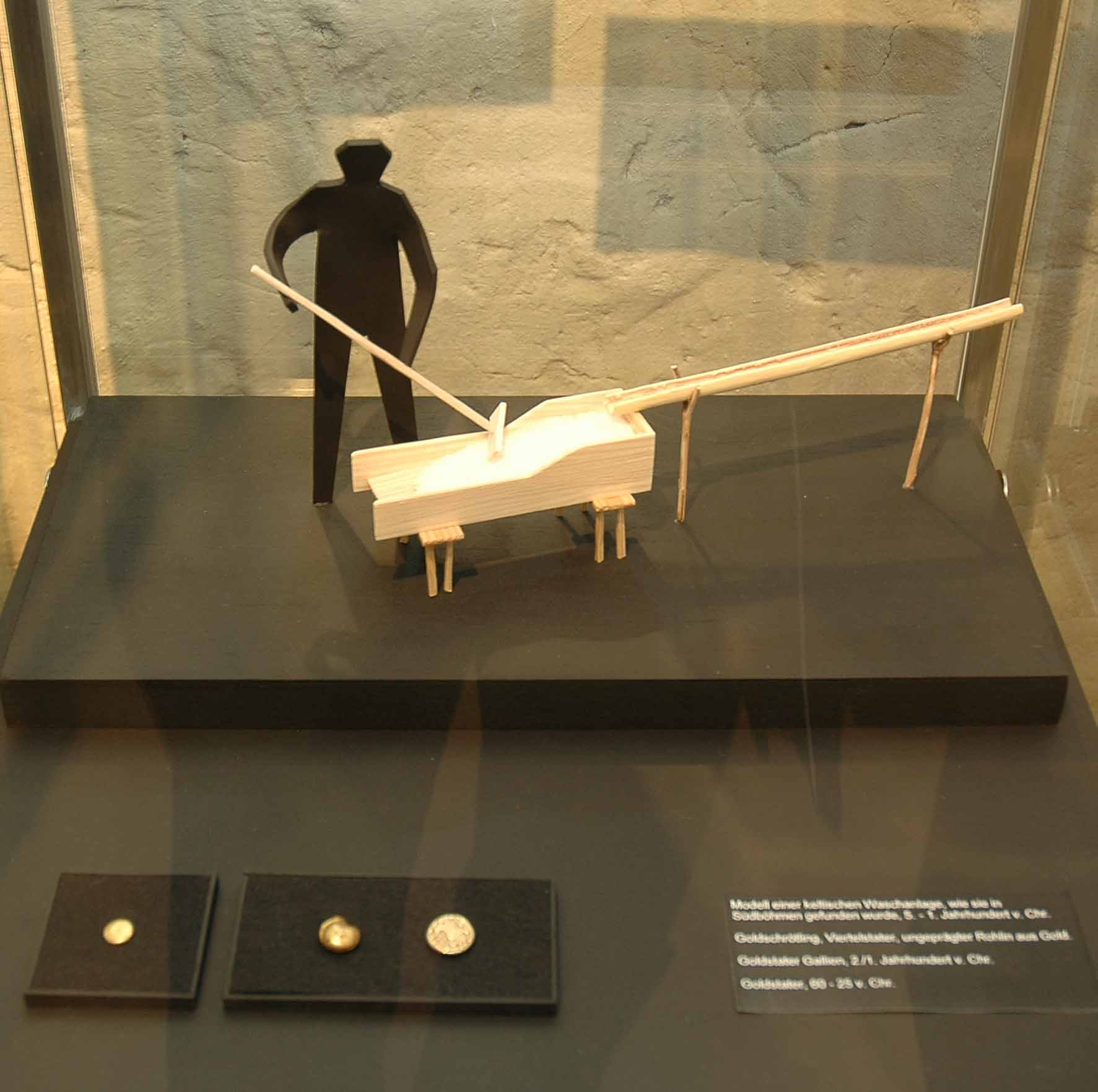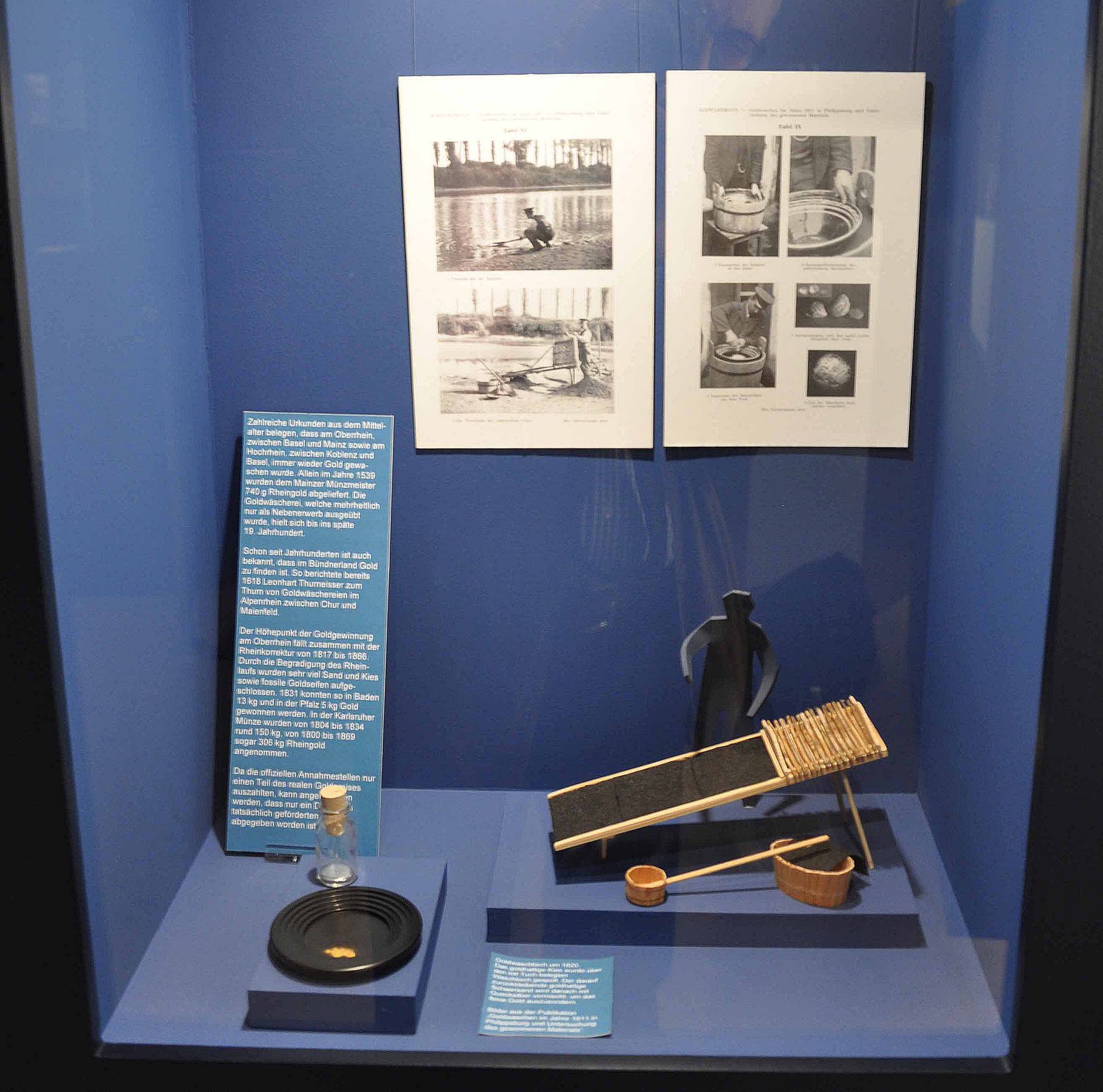 Vor über 2000 Jahren schürften Kelten und Römer Gold im Rhein. Warum gibt es Gold im Rhein? Wieviel Gold ist zu finden? Wann war der Höhepunkt der Goldwäscherei im Rhein? Die Ausstellung ging solchen Fragen nach und dokumentierte mit Bildern und Modellen, wie in den letzten Jahrhunderten Gold aus dem Rhein gewonnen wurde. Der Besucher erfuhr auch, dass während des Höhepunktes der Goldwäscherei über 400 Wäscher an der Arbeit waren und dass nicht nur das Gold, sondern auch der anfallende Schermineralsand von grossem Interesse war. Weiter zeigte sie auch, dass am Oberrhein nur winzige Goldflitter zu finden sind, während im Alpenrhein, mit etwas Glück und viel Geduld, auch kleine Goldnuggets ausgewaschen werden können.